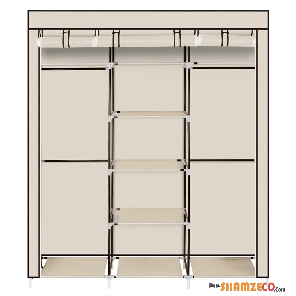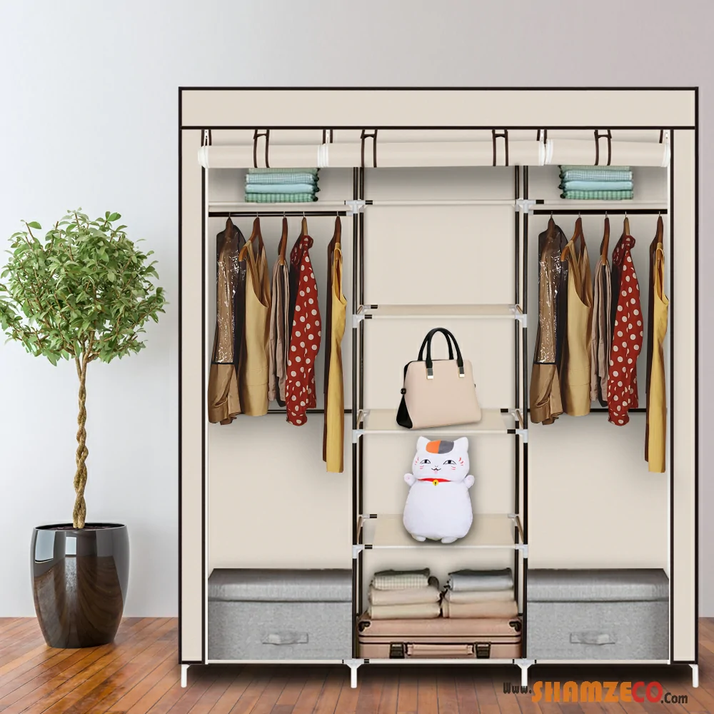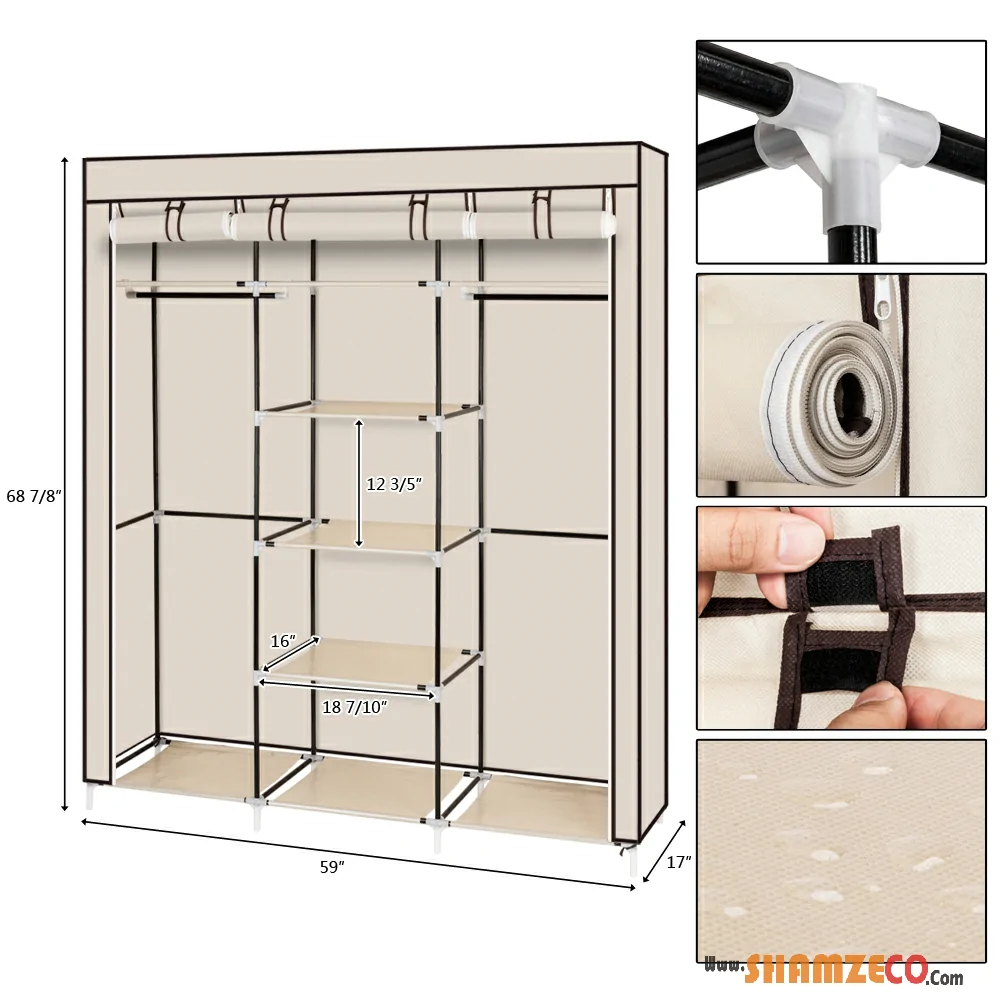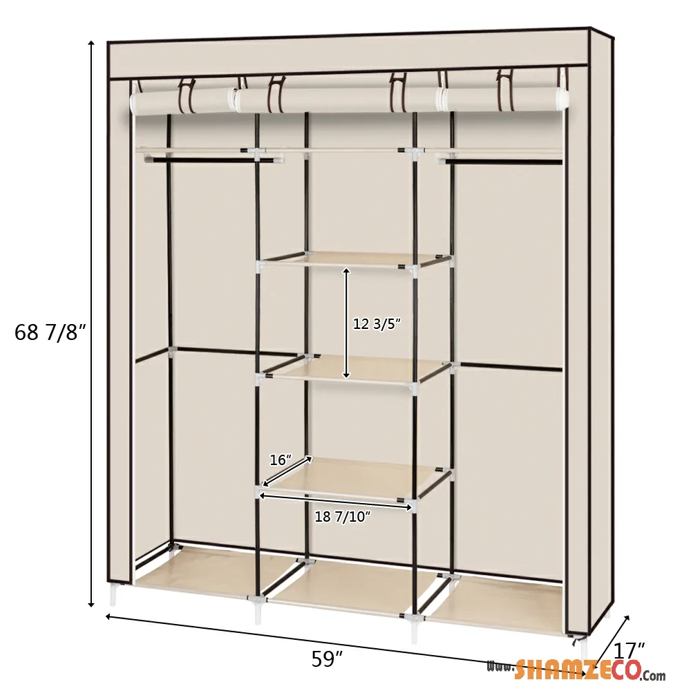 69 Portable Clothes Closet Non-Woven Fabric Wardrobe Double Rod Storage Organizer Beige