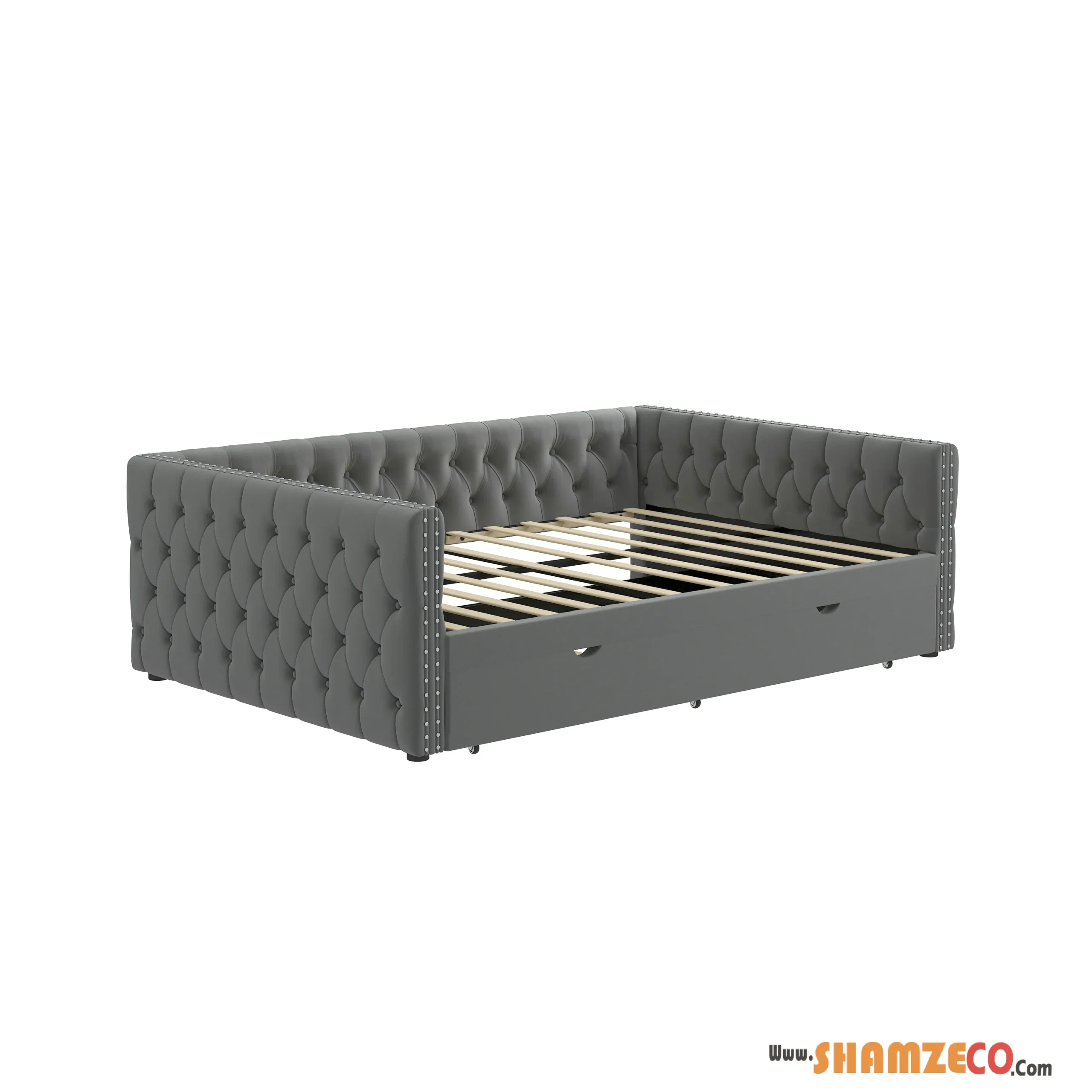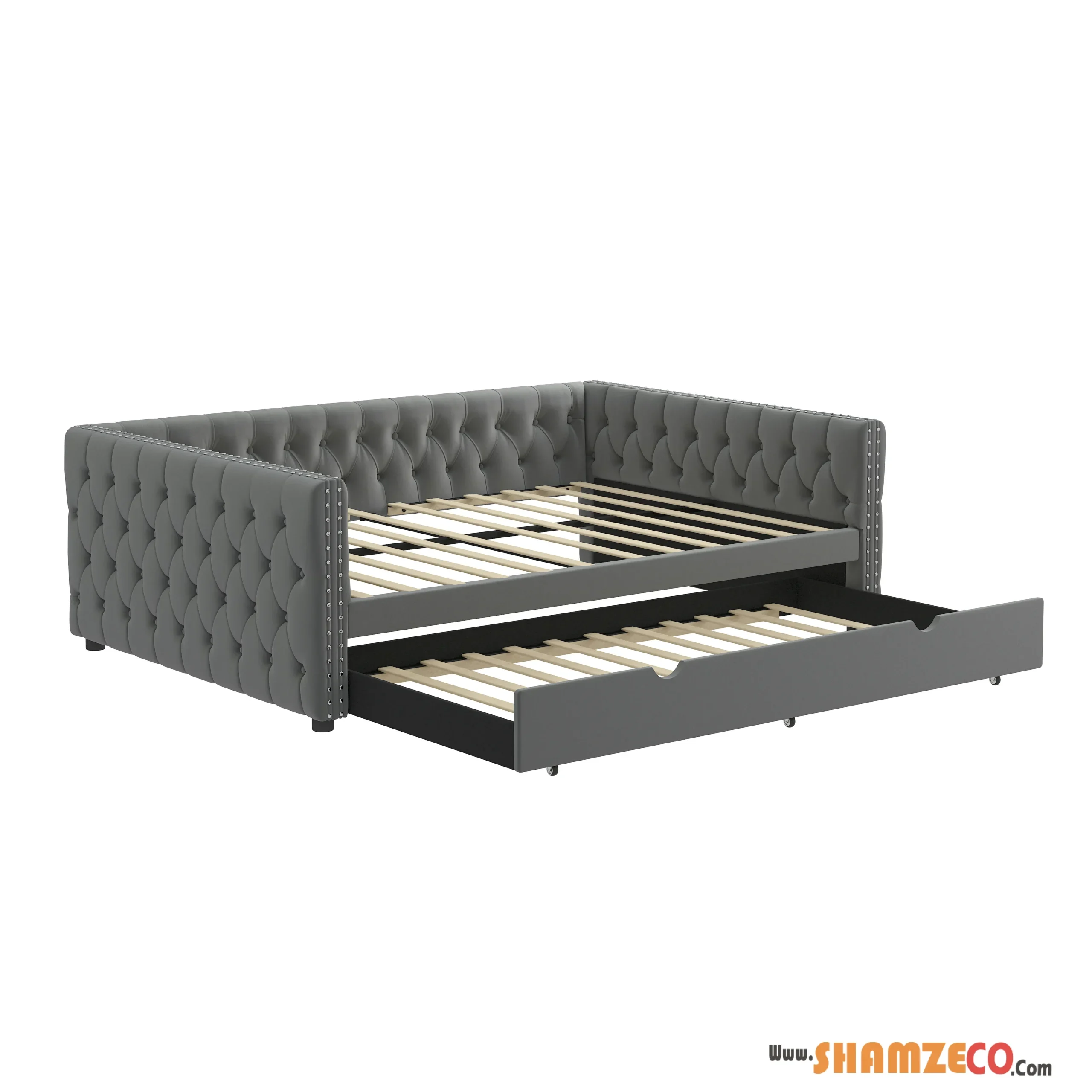 Velvet Tufted Daybed with Twin Trundle, Button & Copper Nail Detail, 83″x57″x26″