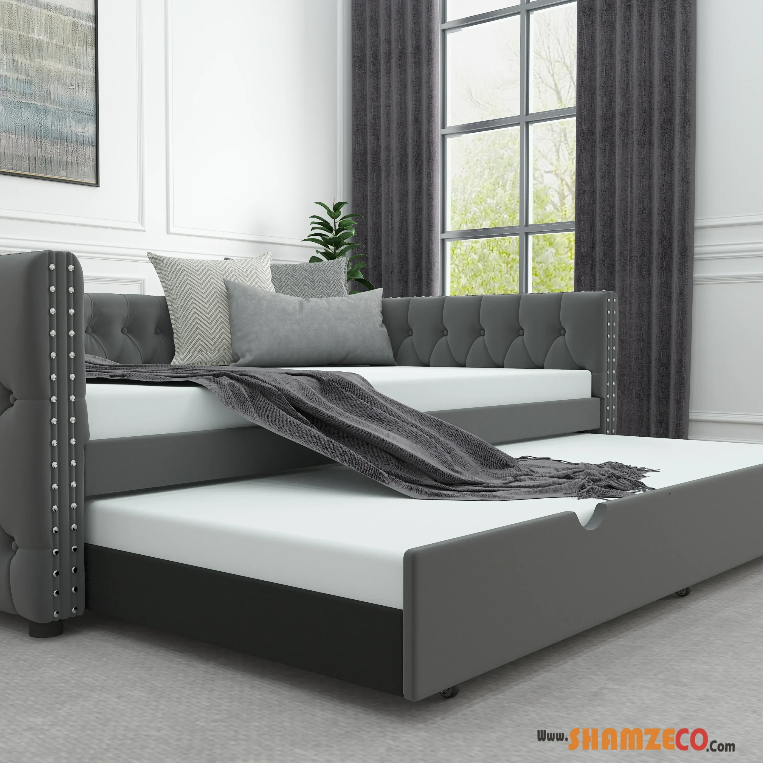 This functional daybed serves multiple purposes—it works as a sofa during the day and a comfortable bed at night. Its pull-out trundle provides extra sleeping space without taking up too much room, making it ideal for small living spaces, kids’ rooms, dorms, and guest bedrooms.