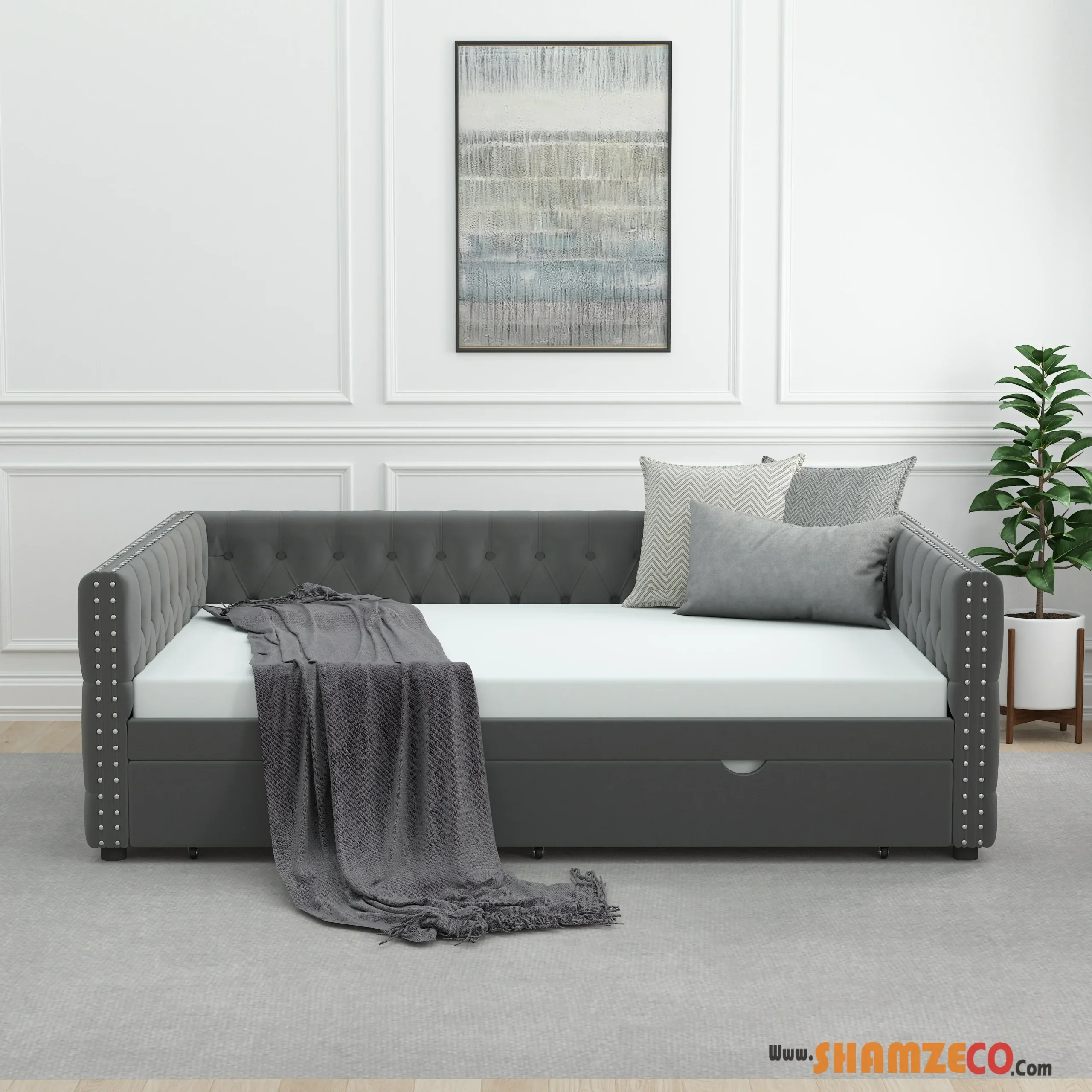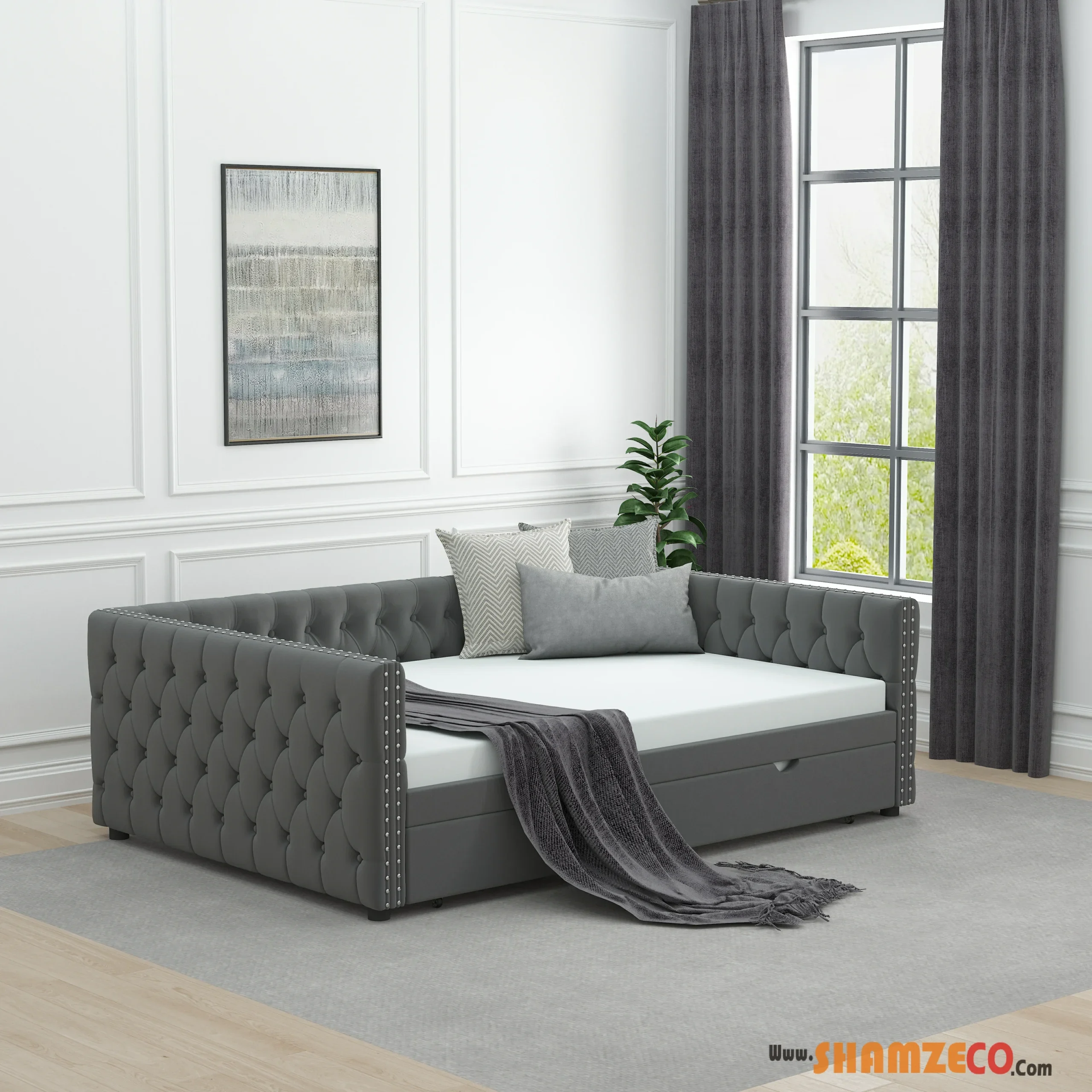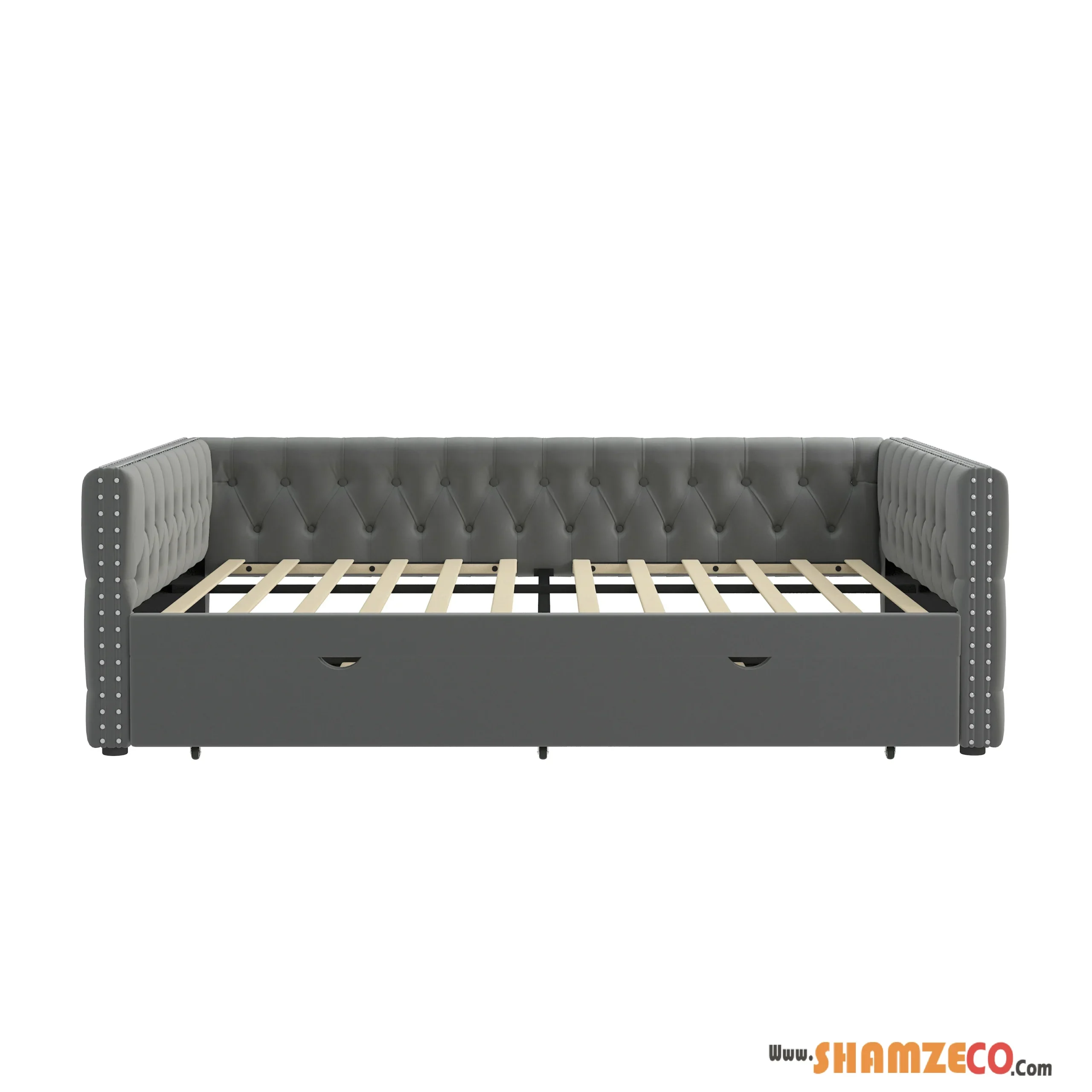 Upgrade your living space with this elegant full-size upholstered daybed, featuring a mid-century modern design that blends seamlessly with various decor styles. The diamond-tufted velvet backrest, nailhead trim along the armrests, and button-tufted detailing create a sophisticated and luxurious look that makes this piece a stunning focal point in any room.