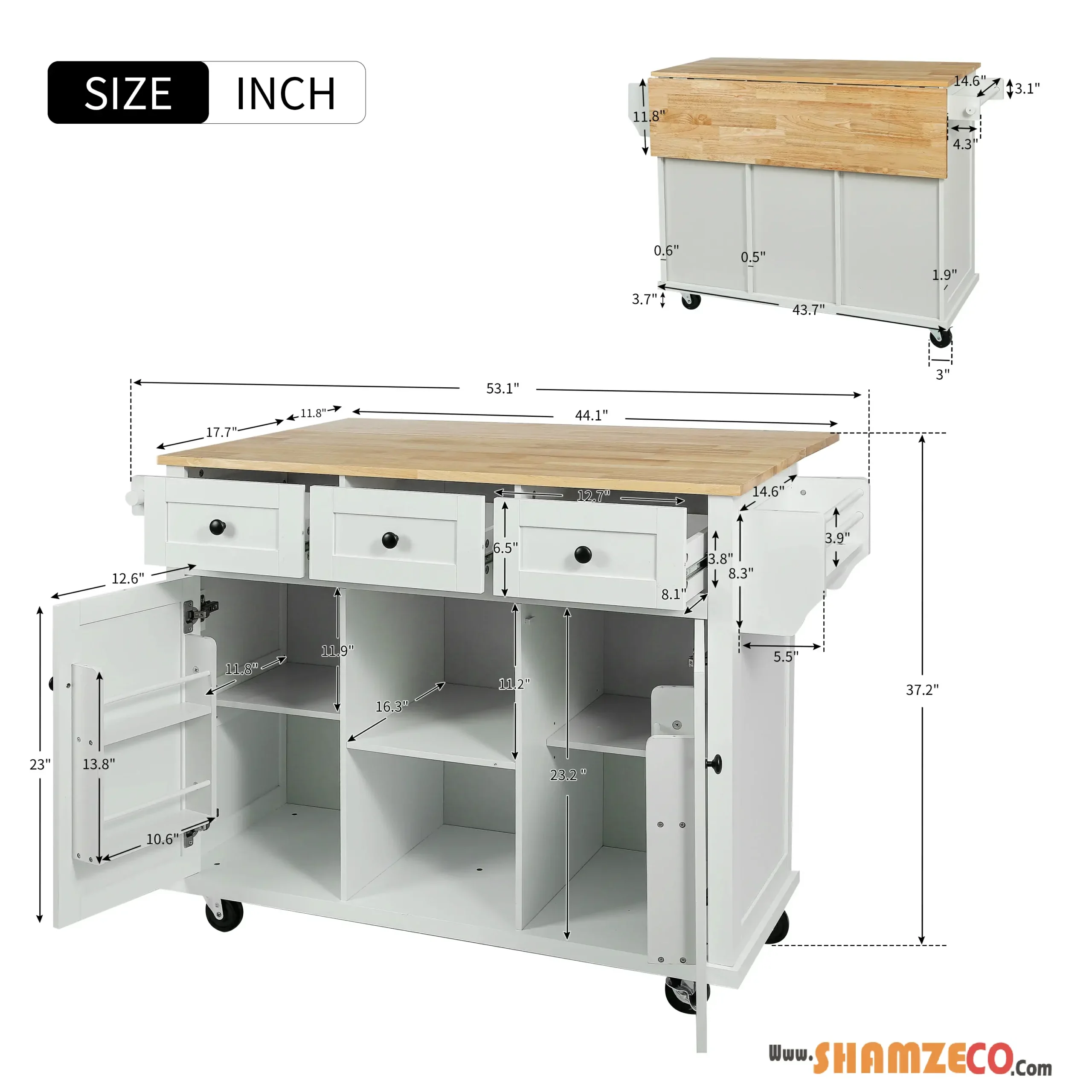 Upgrade your kitchen with this versatile and stylish kitchen island, designed to maximize storage and enhance your workspace. Featuring a durable rubberwood drop-leaf countertop, internal storage racks, and smooth-rolling wheels, this kitchen cart brings both functionality and contemporary elegance to any home.