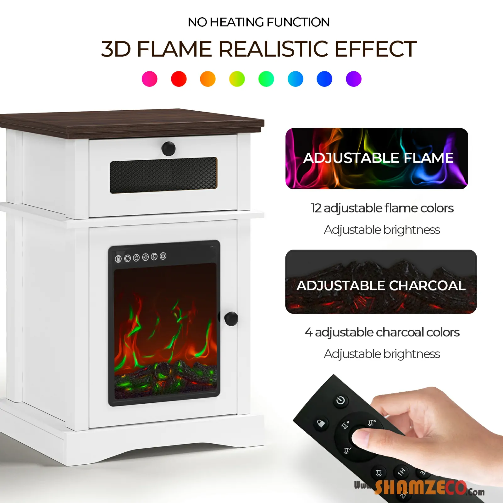 LED Fireplace Nightstand with Drawer, Adjustable Light Bedside Table