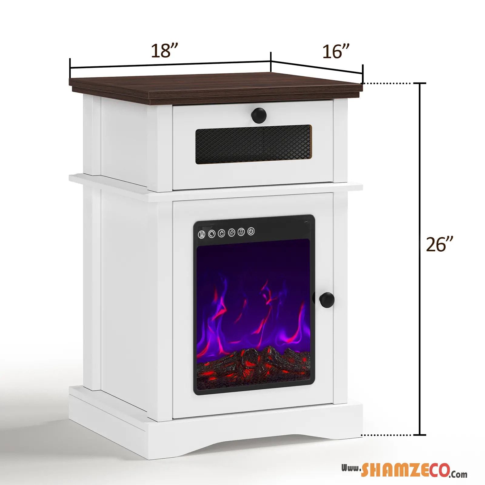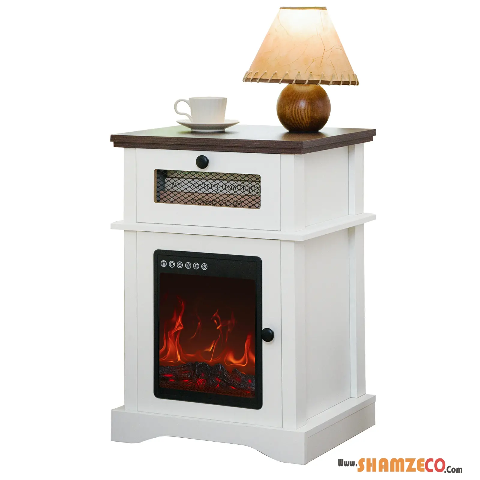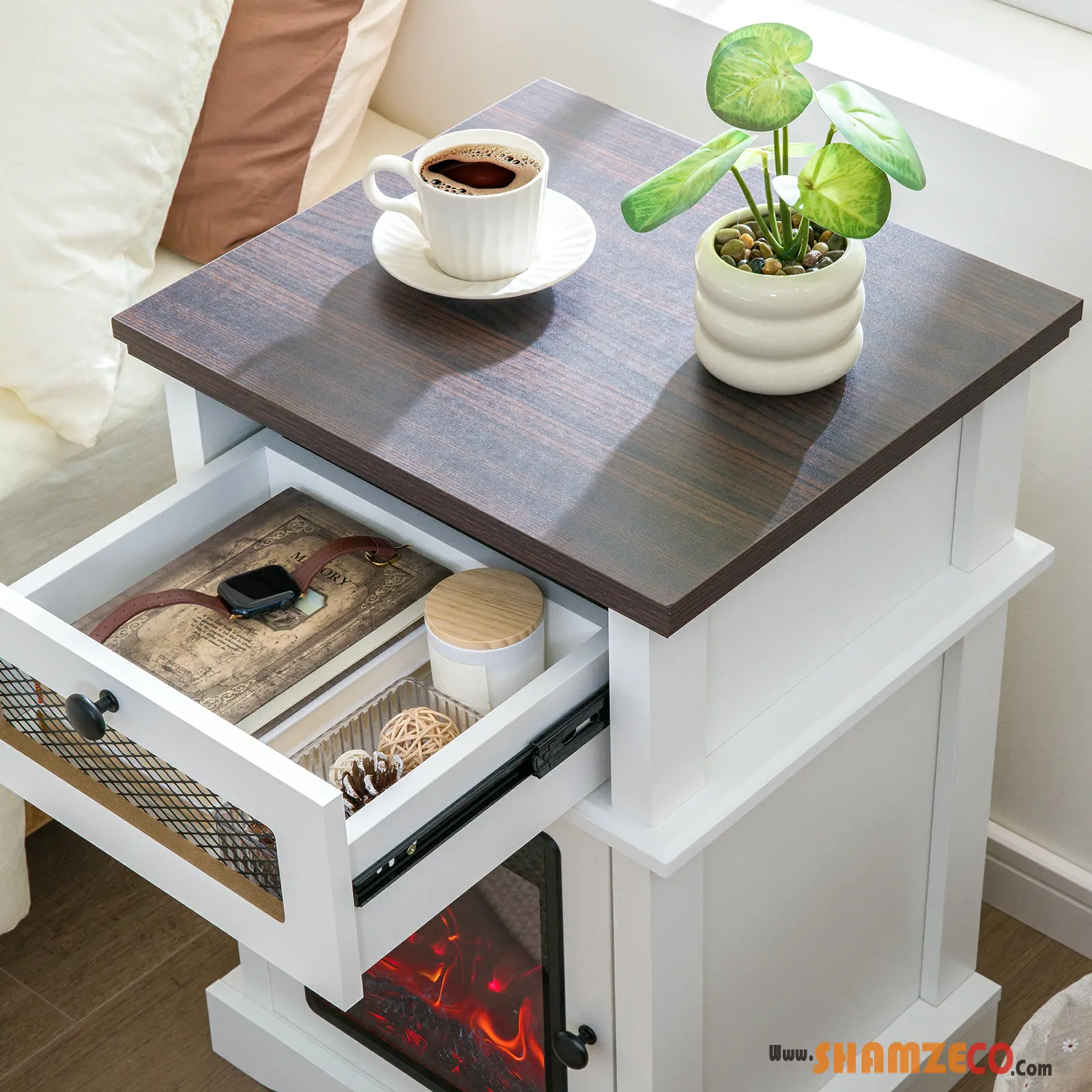 Farmhouse Bedside Table with 3D Flame Fireplace Lamp – Stylish & Functional