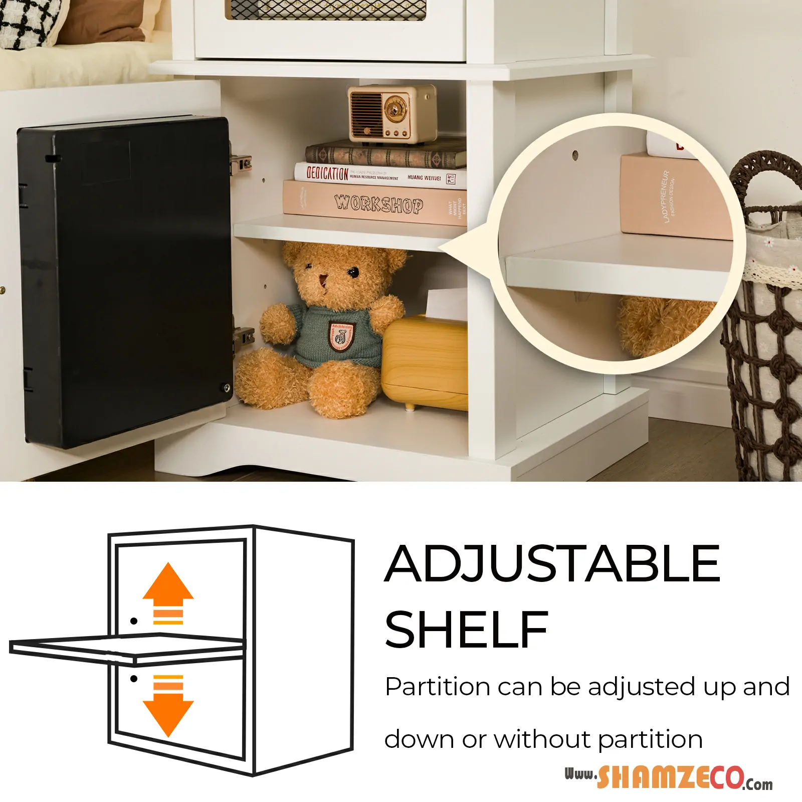 - Drawer + storage cabinet provide ample space for bedside essentials.