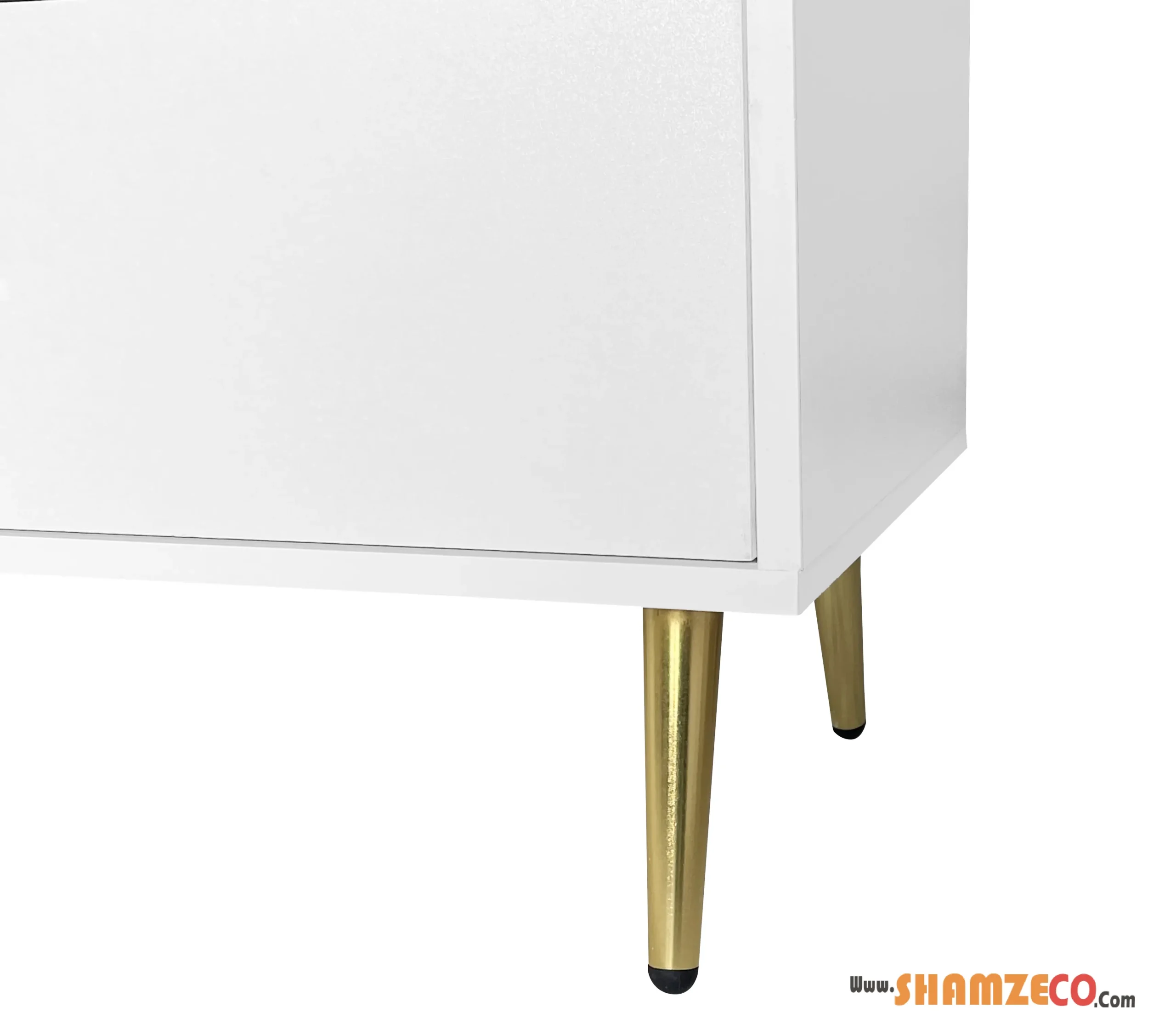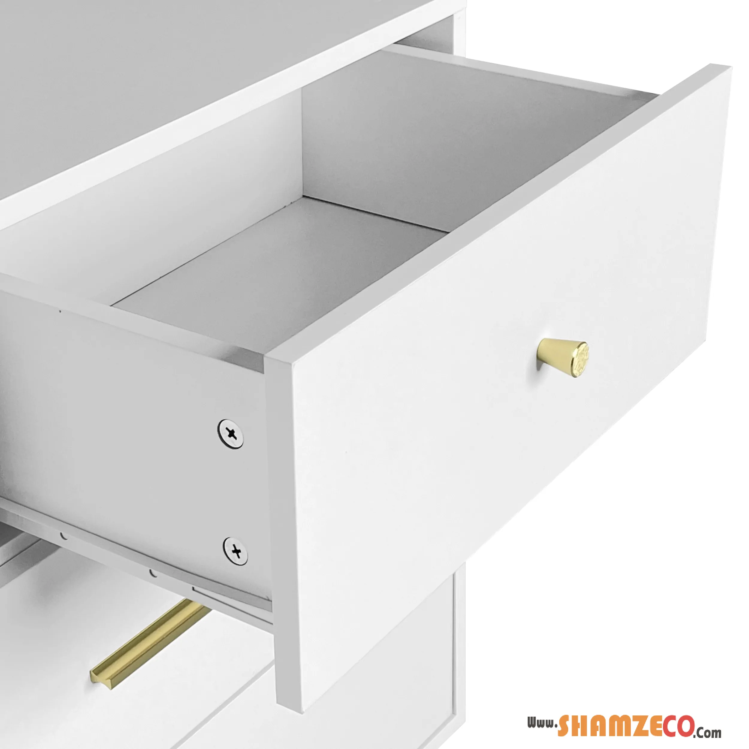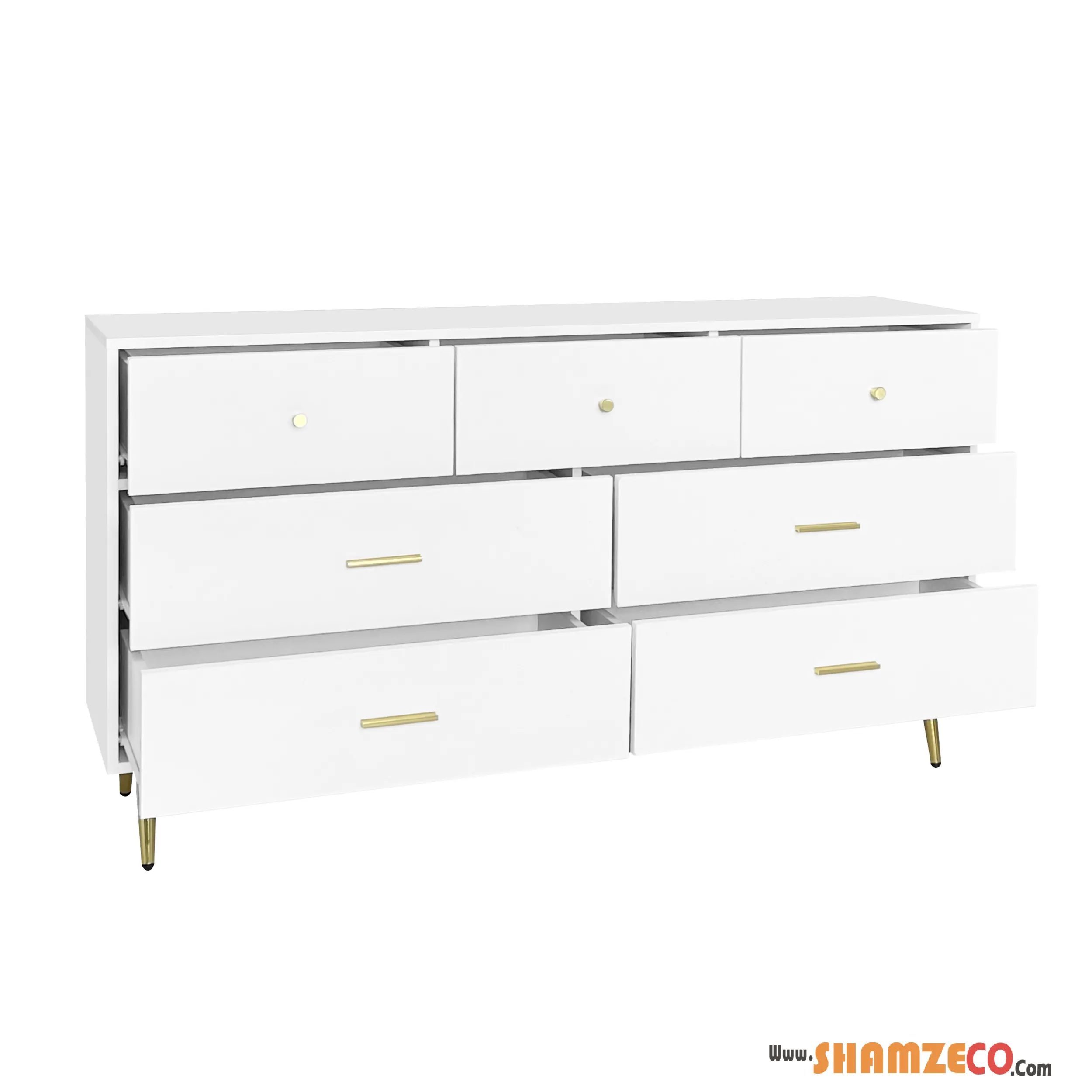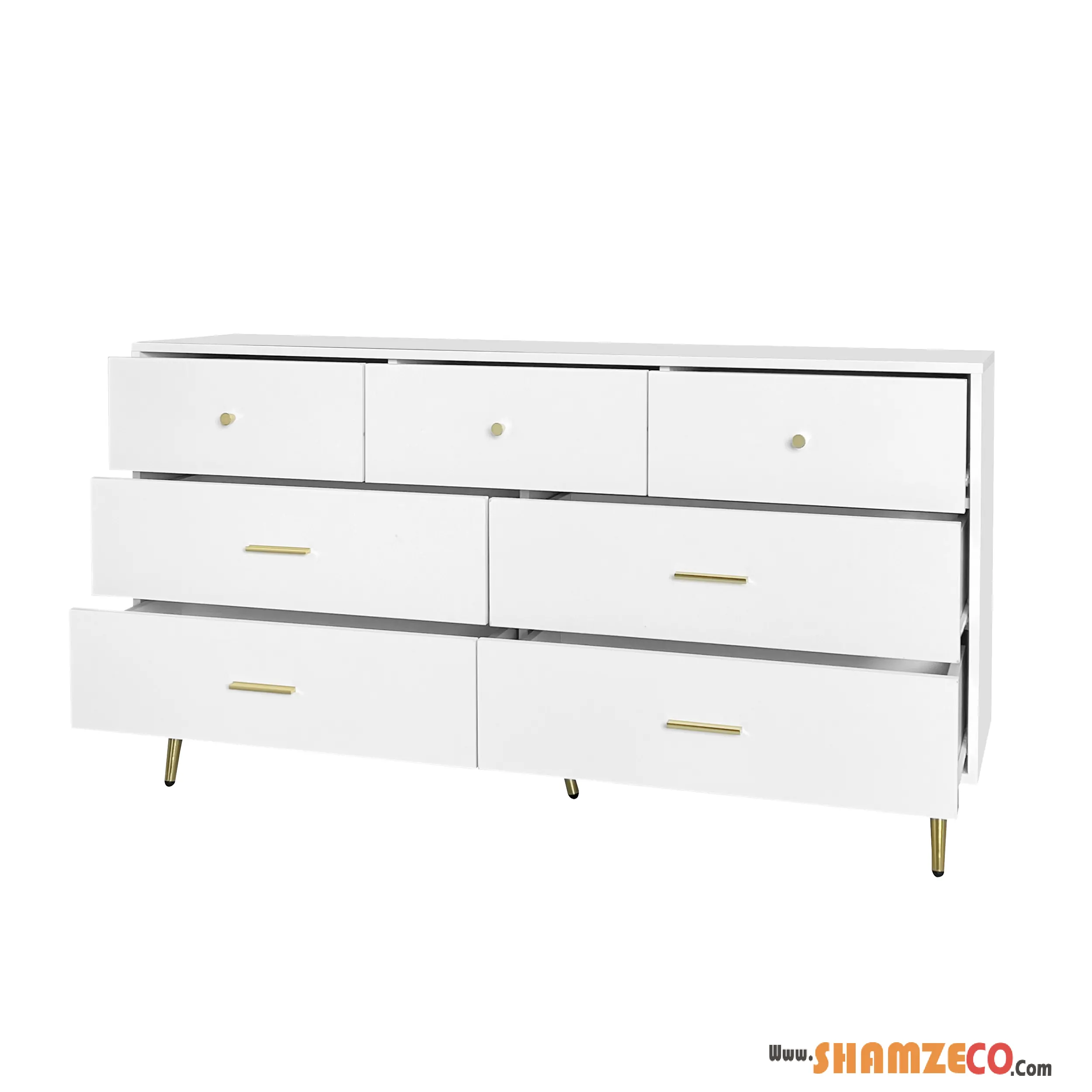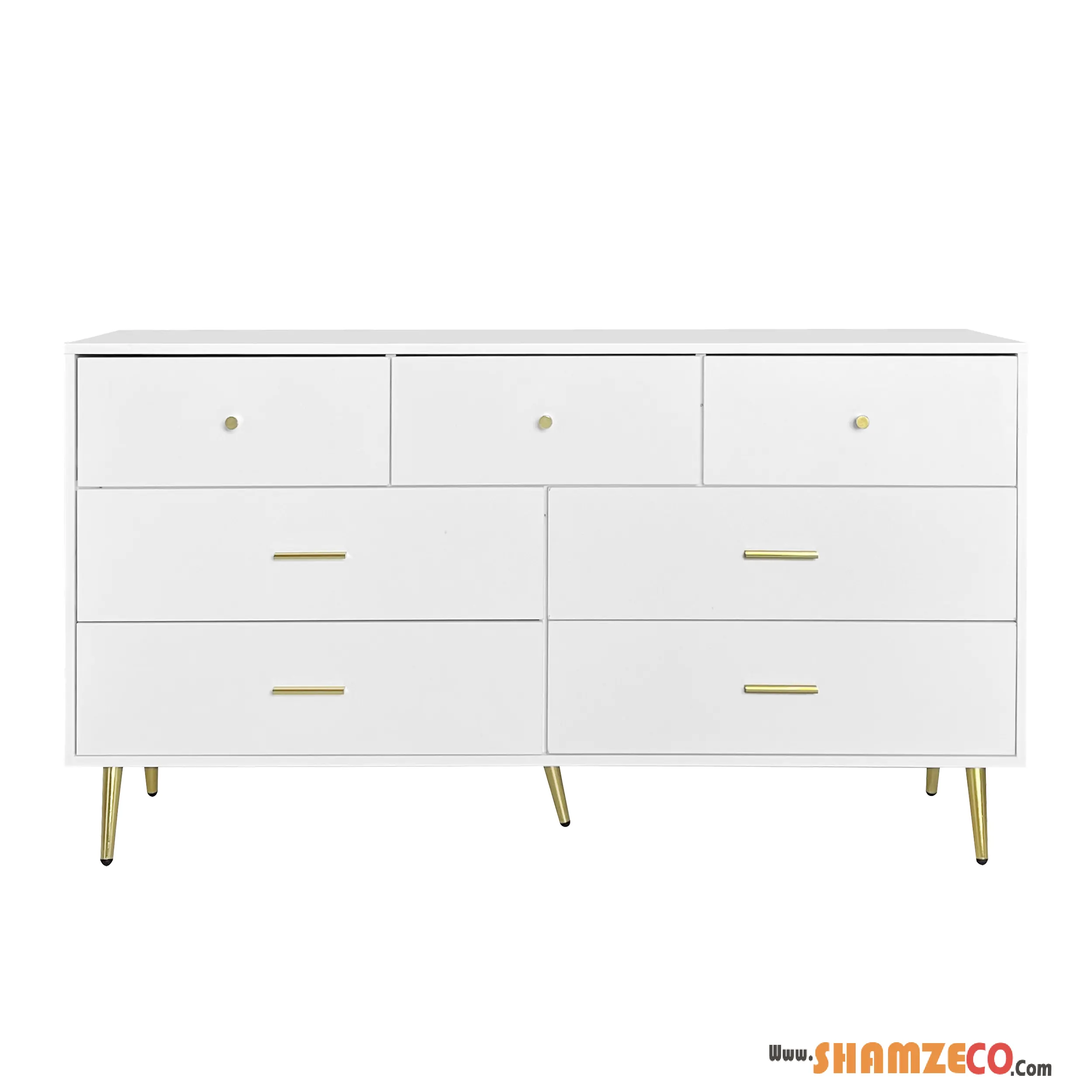 Enhance your bedroom or living space with this sophisticated 7-drawer white dresser. Designed for both style and practicality, this piece features a sleek white finish, gold handles, and gold metal legs, adding a touch of luxury and modern charm to any interior. With ample storage space and a durable construction, it’s the perfect combination of beauty and functionality.