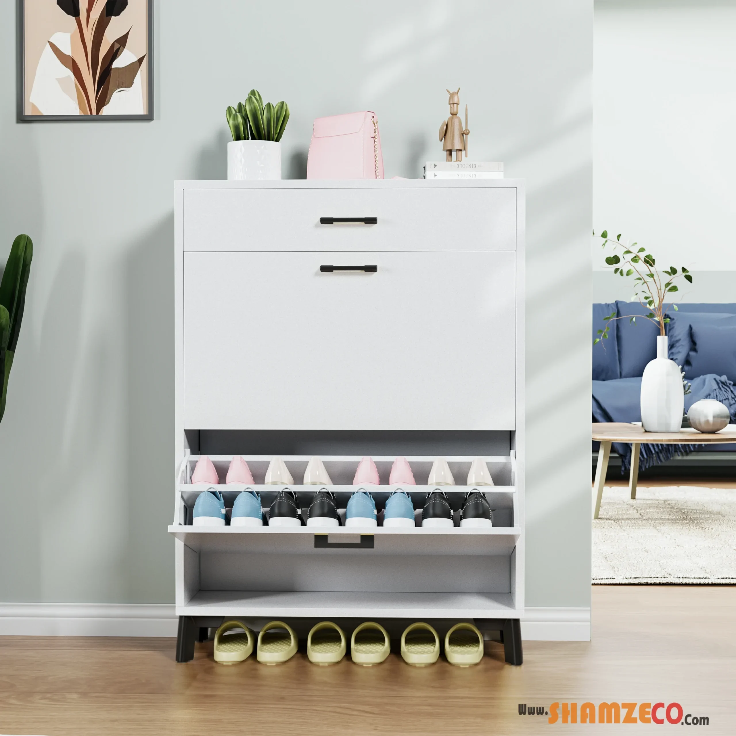 Shoe Storage Cabinet for Entryway, Free Standing Shoe Organizer with 2 Flip Drawers, Hidden Shoe Rack Storage Organizer for Doorway Hallway Closet, White
