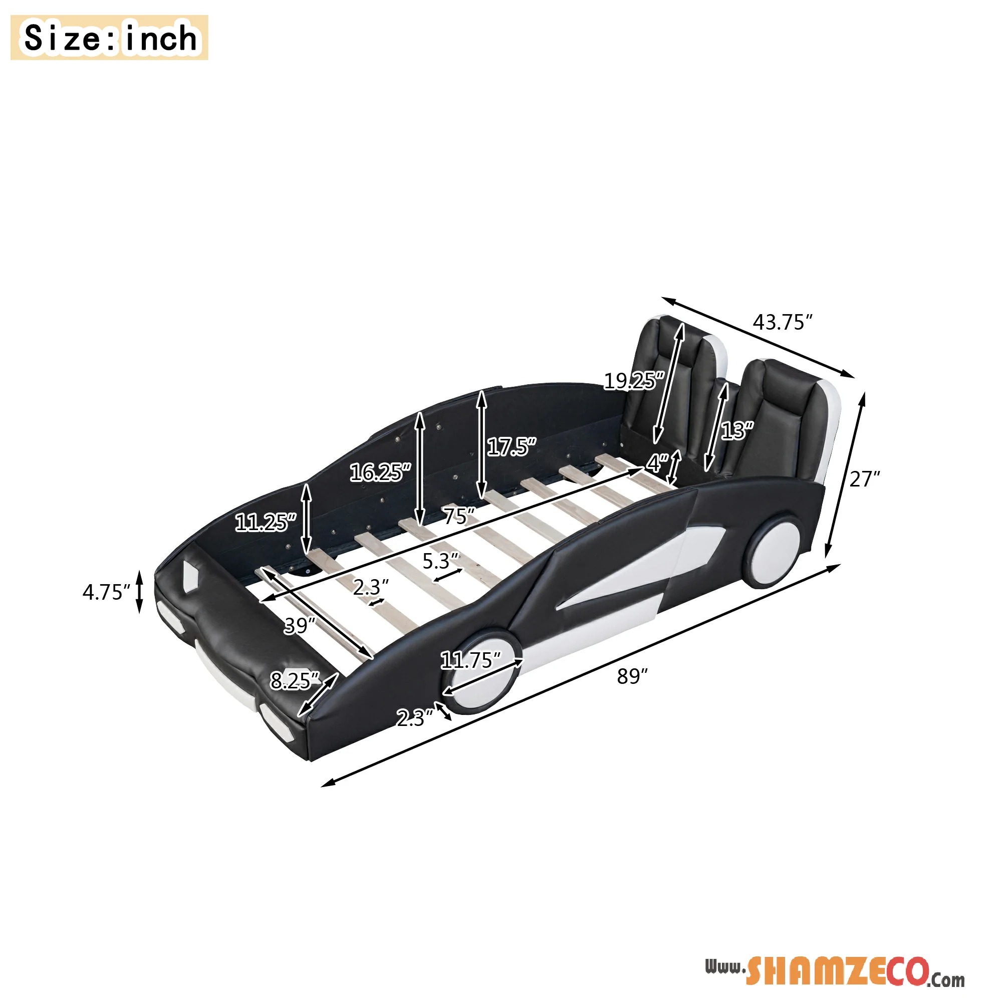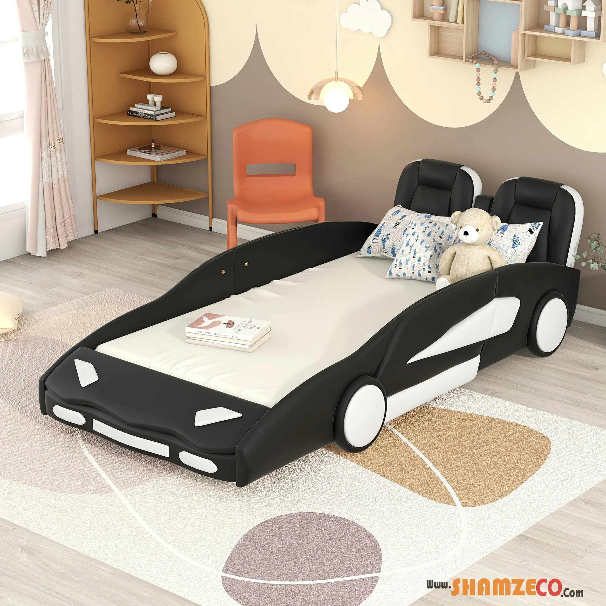 Designed for young racing enthusiasts, this race car-shaped twin bed combines style, comfort, and durability. With its sleek black design and fun wheel accents, it’s sure to be the centerpiece of any child’s bedroom. Built from premium pine wood, MDF, and PU, this bed is both sturdy and long-lasting.